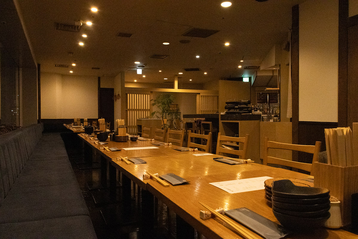 木の温もりを感じる広々とした店内には、テーブル席のほかリニューアルされたカウンター席と、接待にも便利な個室も加わり、幅広いシーンで利用いただけるように。ご宴会に人気のこたつテラスは10月中旬スタート予定です!